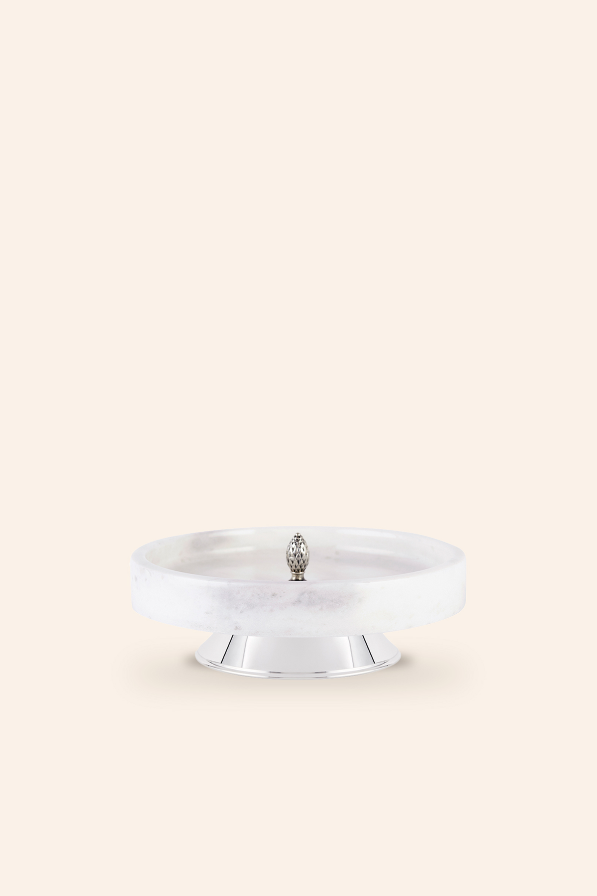 Features a marble tray, micron silver-plated brass base, and scratch-resistant leather underside. Safe for food contact with natural marble variations.