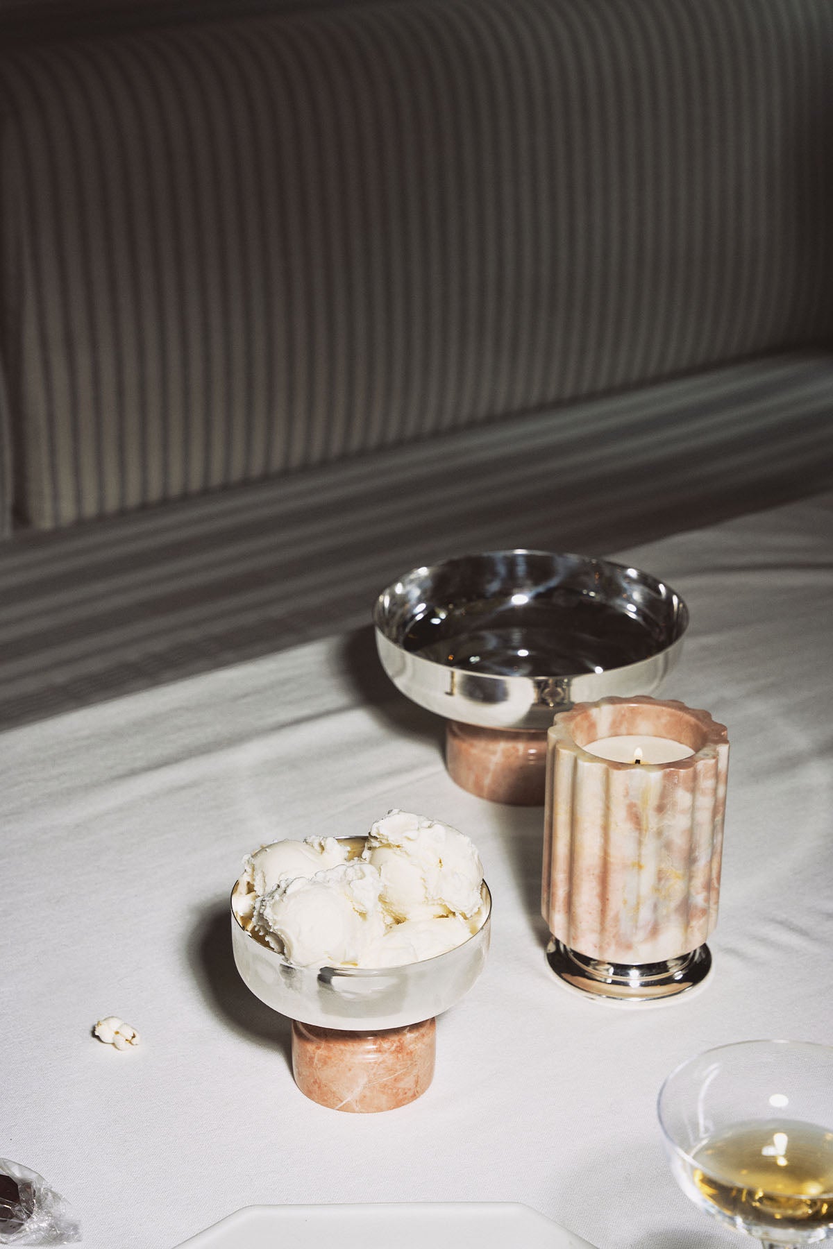 Features: Micron silver-plated over brass. Safe for food contact. Slight variations in marble veins may occur. 100% organic candle.