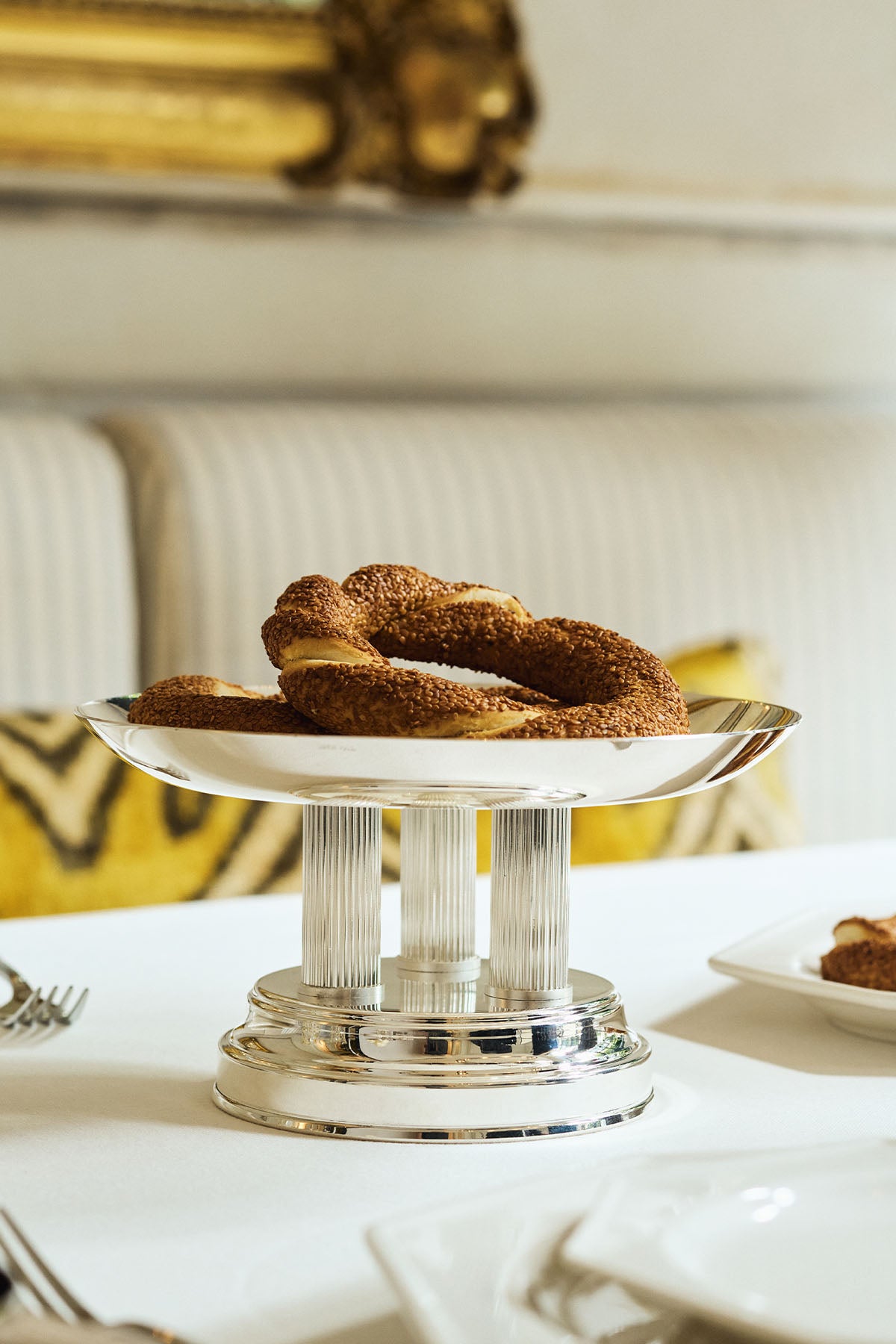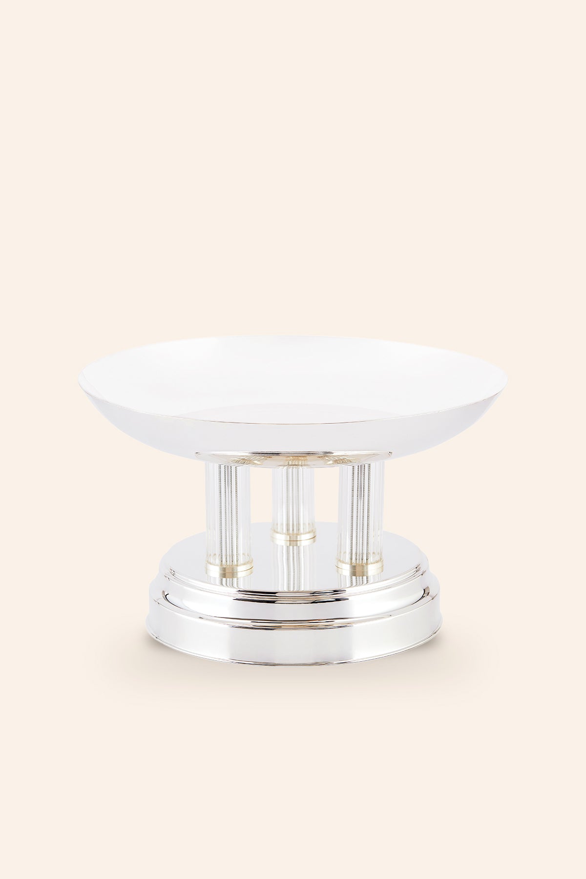 Features: Micron silver-plated over brass. Glass columns. Safe for food contact. Scratch-resistant leather bottom.