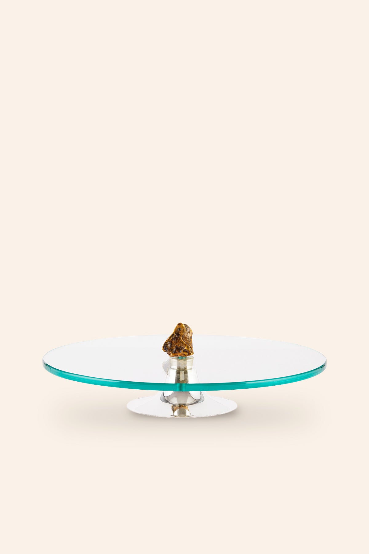 Features: Micron silver-plated over brass. Glass top surface. Safe for food contact. Scratch-resistant leather bottom.